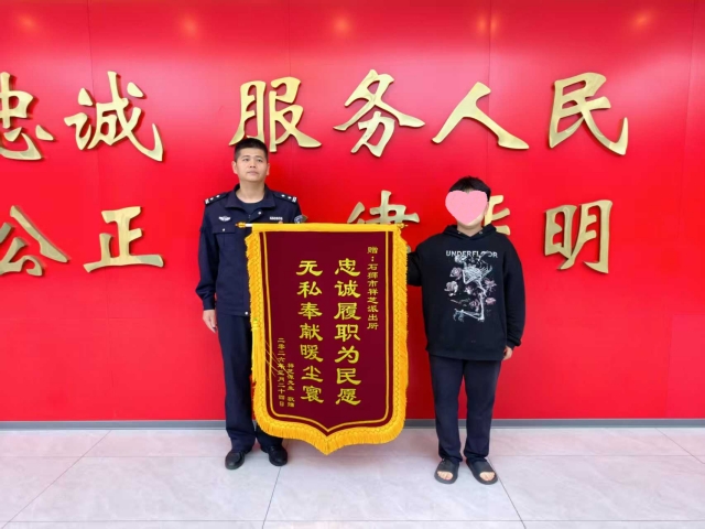 近日,市民谭先生专程来到石狮市公安局祥芝派出所,将一面印有感谢话语的锦旗送到民警手中,对民警快速反应、尽心尽责,帮助其找回遗失的万元现金表示由衷感谢。这面锦旗,不仅承载着群众的真挚谢意,更见证了警民之间的鱼水情深。