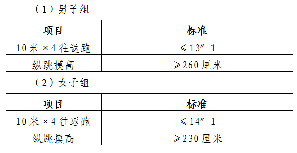 1.整体要求:报名审核通过的考生方可参加体能测试,结果分为合格和不合格。注意:参加体能测试前,考生的身体状况必须能够适应剧烈活动,否则取消体能测试资格。